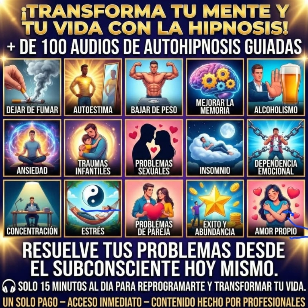 Descubre el Mega Pack de Autohipnosis con más de 100 audios profesionales diseñados para ayudarte a liberar bloqueos, sanar emociones y alcanzar tu máximo potencial.